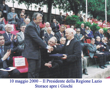 Mercoledì 10 maggio Francesco Storace, neo eletto Presidente della Regione Lazio, legge il giuramento dei Giochi che iniziano con la sfilata degli atleti accompagnati dalla musica della Banda di Cave che intona l’Inno d’Italia. Queste miniolimpiadi, volute e ideate da fr. Valentino, sono arrivate ormai alla 16° edizione e la scuola oggi appare vestita a festa con vasi di fiori e allestimenti superbi dovuti alle mani d’oro di fr. Roberto Roberti.