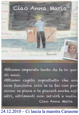 Ma i lutti non sono ancora finiti: alla vigilia di Natale, il 24 dicembre 2010, ci lascia anche la maestra Anna Maria Carusone. Sempre coerente con se stessa e con i valori in cui credeva, ha mantenuto inalterata questa sua fede dal 1991, anno in cui ha iniziato a lavorare alla Scuola La Salle, fino all’ultimo giorno del suo impegno educativo. Sono stati vent’anni di simpatia, generosità e attenzione nei confronti degli alunni che le hanno consentito di divenire per tutti un punto di riferimento, saldo e autorevole. Da questo giorno gli alunni della sua classe decidono di ricordarla prima di ogni partita scolastica di calcio.