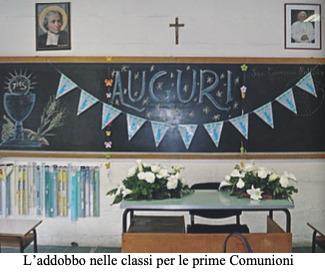 A giugno, con la tradizionale Festa di Fine Anno, si dà l’addio ad un altro anno di scuola e si ripone il grembiule per un po’ di tempo. Il nostro Istituto nel 2002 si appresta a compiere 65 anni, l’anno della pensione per molti. Ma ormai ha assunto nel quartiere l’aspetto di una bella signora che non dimostra gli anni che ha e rimane giovane perché con i giovani ha un rapporto meraviglioso. Anzi il suo fascino è migliorato con il tempo perché ha saputo rinnovarsi ed adeguarsi al mutare dei costumi. Ricordiamoci che siamo alla Santa presenza di Dio. Adoriamolo.